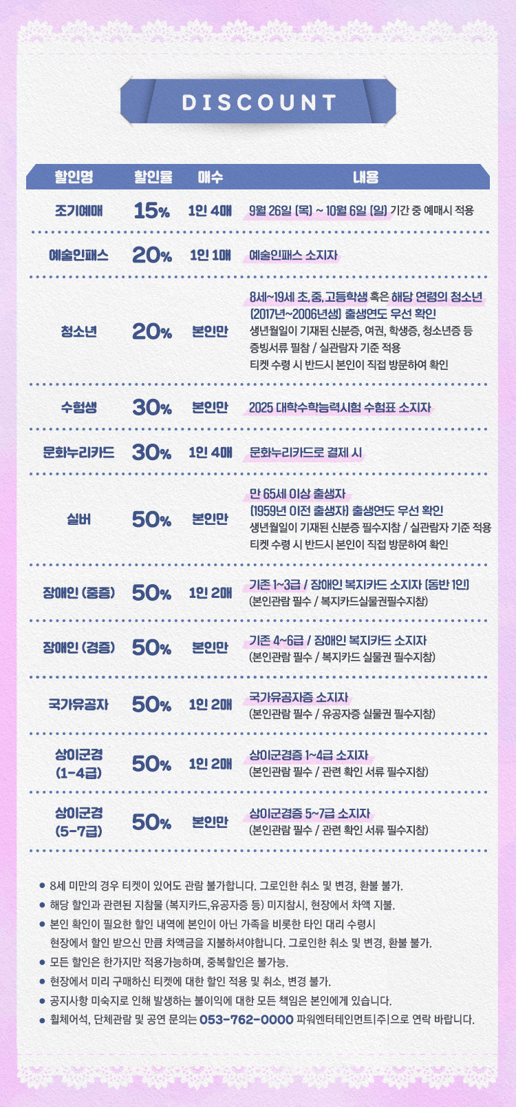 문의 : 053-762-0000 (파워엔터테인먼트㈜)