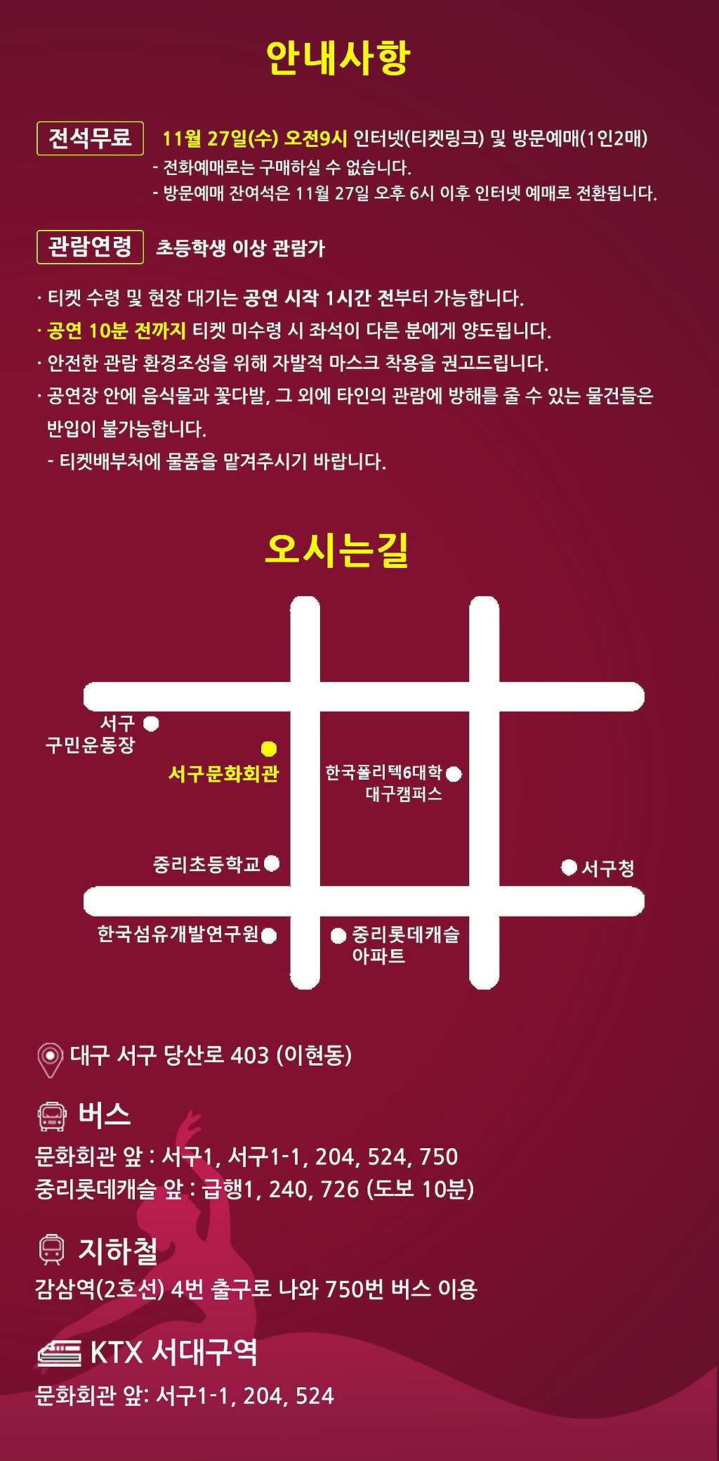 문의 : 053) 663-3081 (대구광역시 서구문화회관)