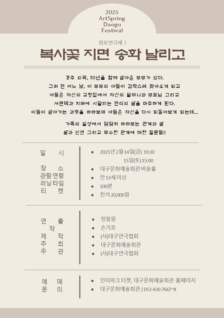#대구연극 #대구뮤지컬 #대구공연 #대구문화 #대구공연정보 #대구문화예술회관 #아츠스프링대구페스티벌 #원로연극제 #연극_복사꽃지면송화날리고 #대명공연거리 #대구일반인극단 #대구일반인연극 #해아람 #포시즌스카이