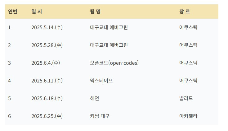 (재)대구문화예술진흥원(원장 박순태) 대구문화예술회관 소속 코오롱야외음악당에서는 5월 14일부터 6월 25일까지 수요일 오후7시, 코오롱야외음악당 잔디광장에서 청년 버스킹을 총 6회 진행합니다.