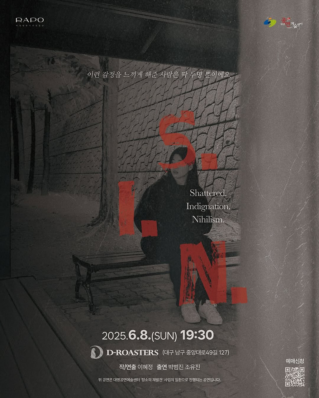 2023년 부터 대명공연예술센터에서 진행하고 있는 「장소의 재발견」 은 대명동 공연집적거리의 새로운 공연 공간들을 탐색하고 발굴하여 그 공간을 새롭게 보거나 기존의 특성, 매력을 드러내 대명공연거리 활성화 및 공연예술의 다양한 실험과 시도를 시도하는 창작 프로그램입니다. 이번 상반기 선정된 작품은 연극창작집단'라포'의 연극<S.I.N>으로 카페 디로스터스에서 공연됩니다. 열린 공간에서 열린 공연을 함께 관람하실 참여자를 모집합니다.