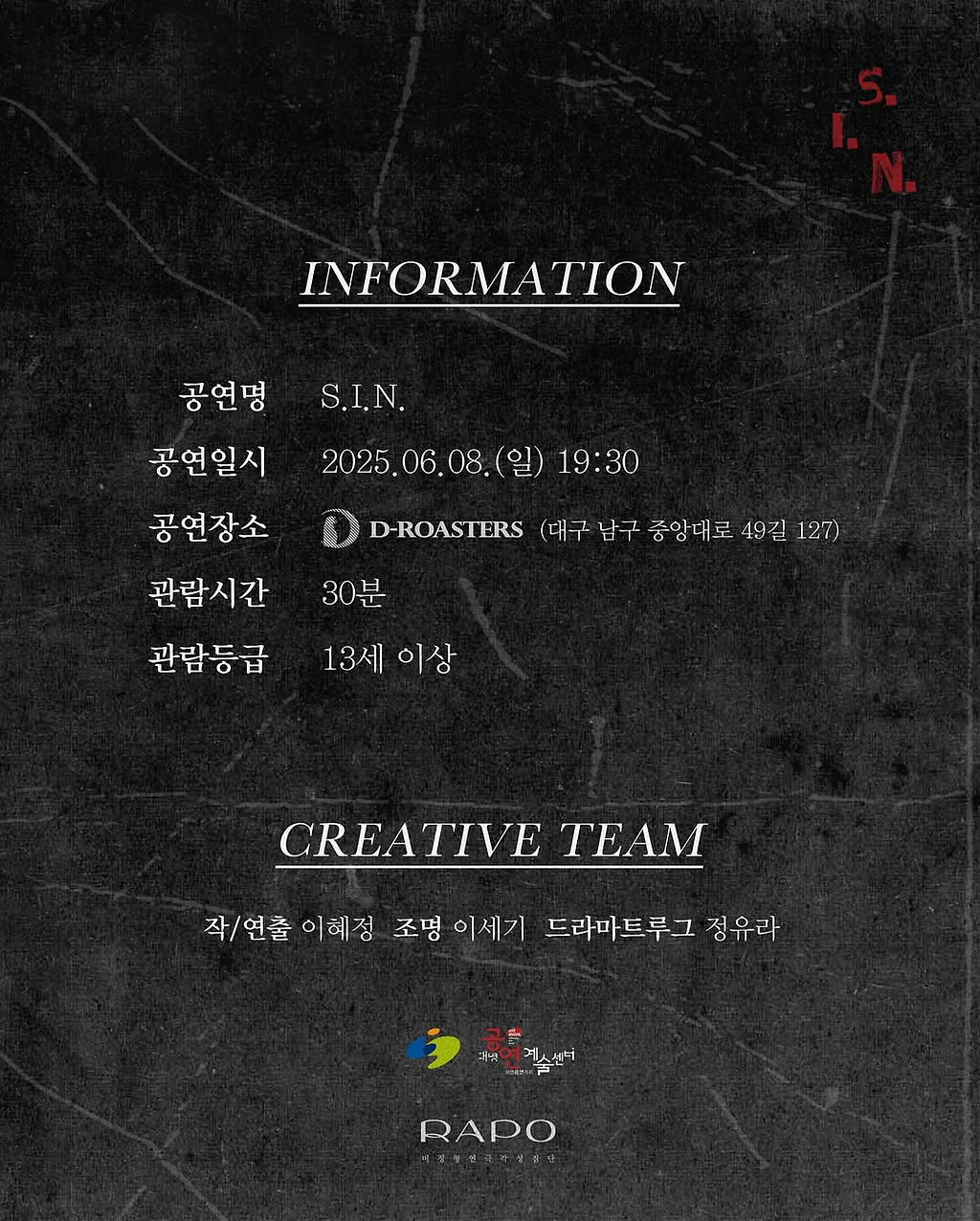 #대구연극 #대구뮤지컬 #대구공연 #대구문화 #대구공연정보 #대명공연거리 #대구무료공연 #장소의재발견 #연극창작집단_라포 #연극_SIN #카페_디로스터스 #대구일반인극단 #대구일반인연극 #해아람 #포시즌스카이