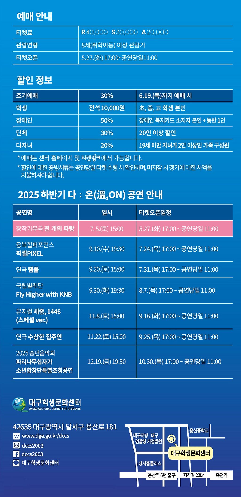 #대구연극 #대구뮤지컬 #대구공연 #대구문화 #대구공연정보 #대구학생문화센터 #창작가무극_천개의파랑 #서울예술단 #대명공연거리 #대구일반인극단 #대구일반인연극 #해아람 #포시즌스카이