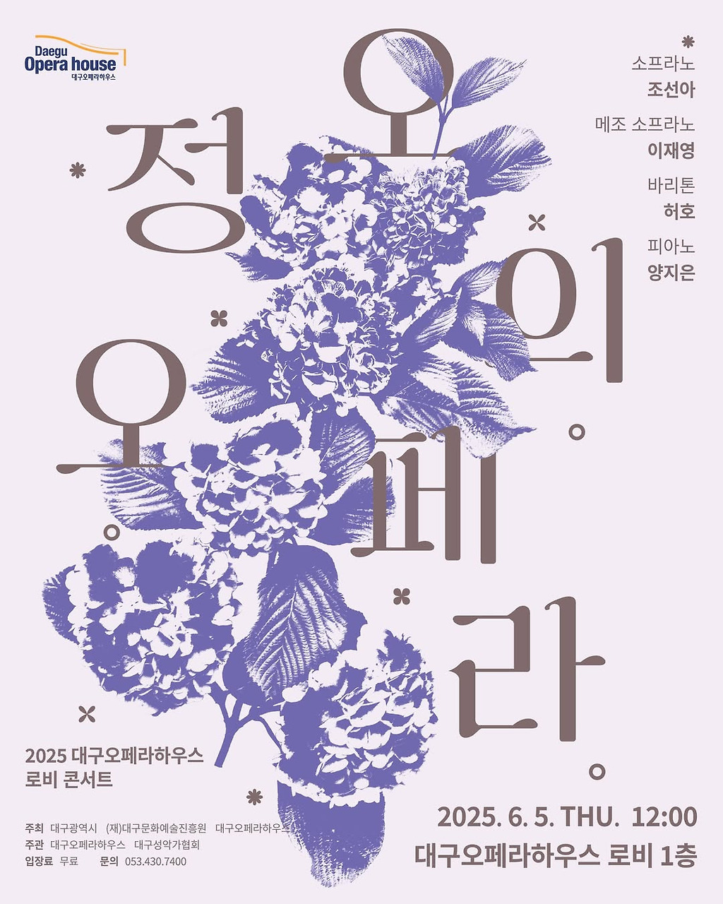 대구오페라하우스는 대구성악가협회와 함께 5–6월, 9–11월 총 10회에 걸쳐 로비콘서트 <정오의 오페라>를 선보입니다.