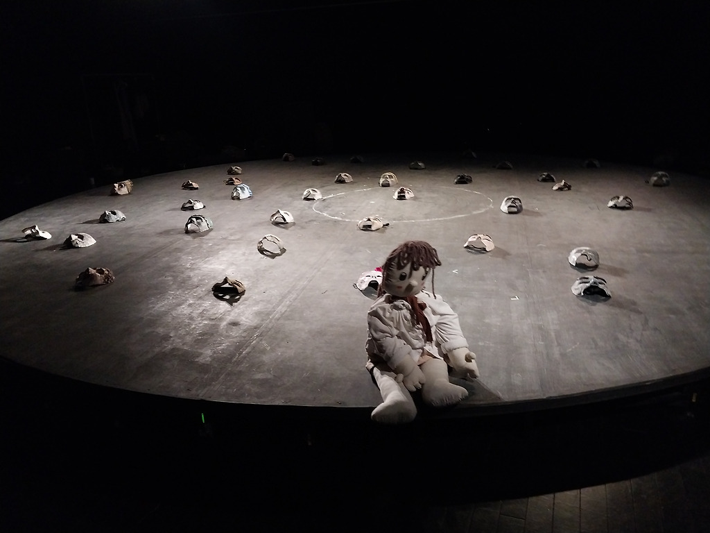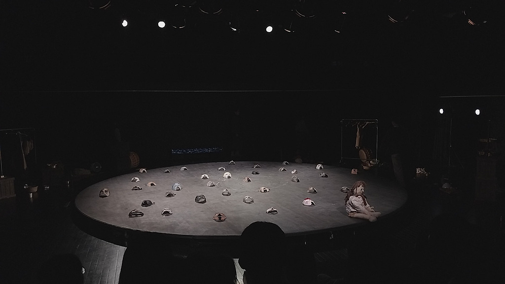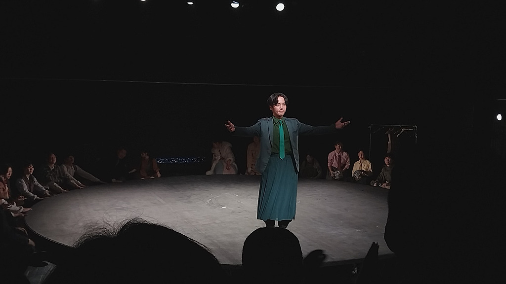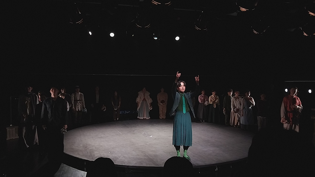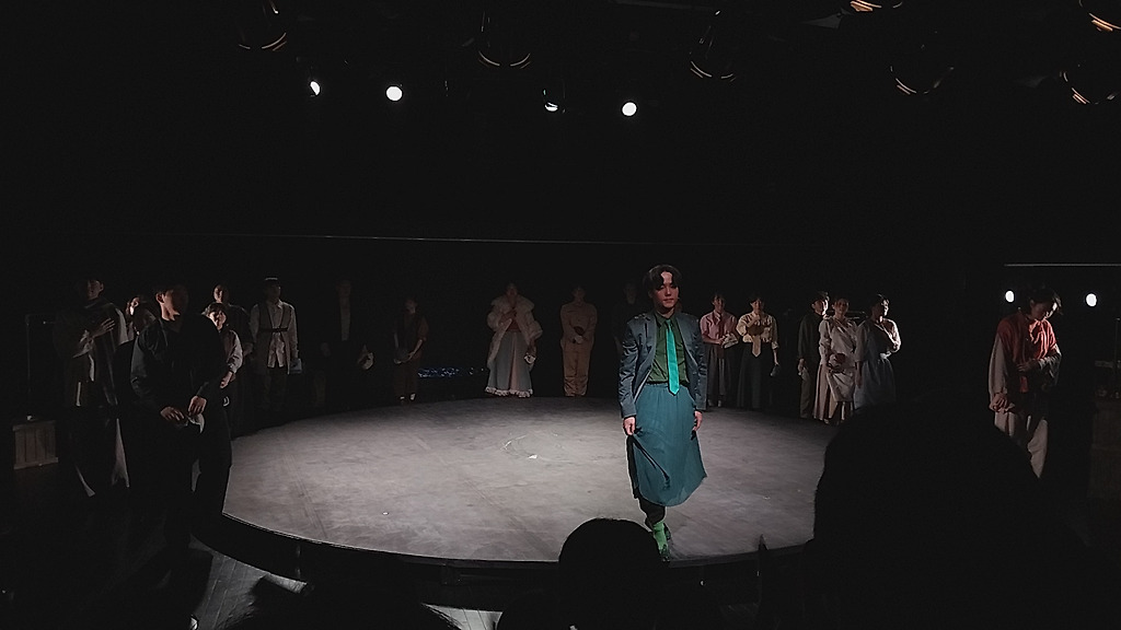 원형의 회전무대 위에서의 공연, 무대를 둘러싼 배우들이 등, 퇴장을 하고