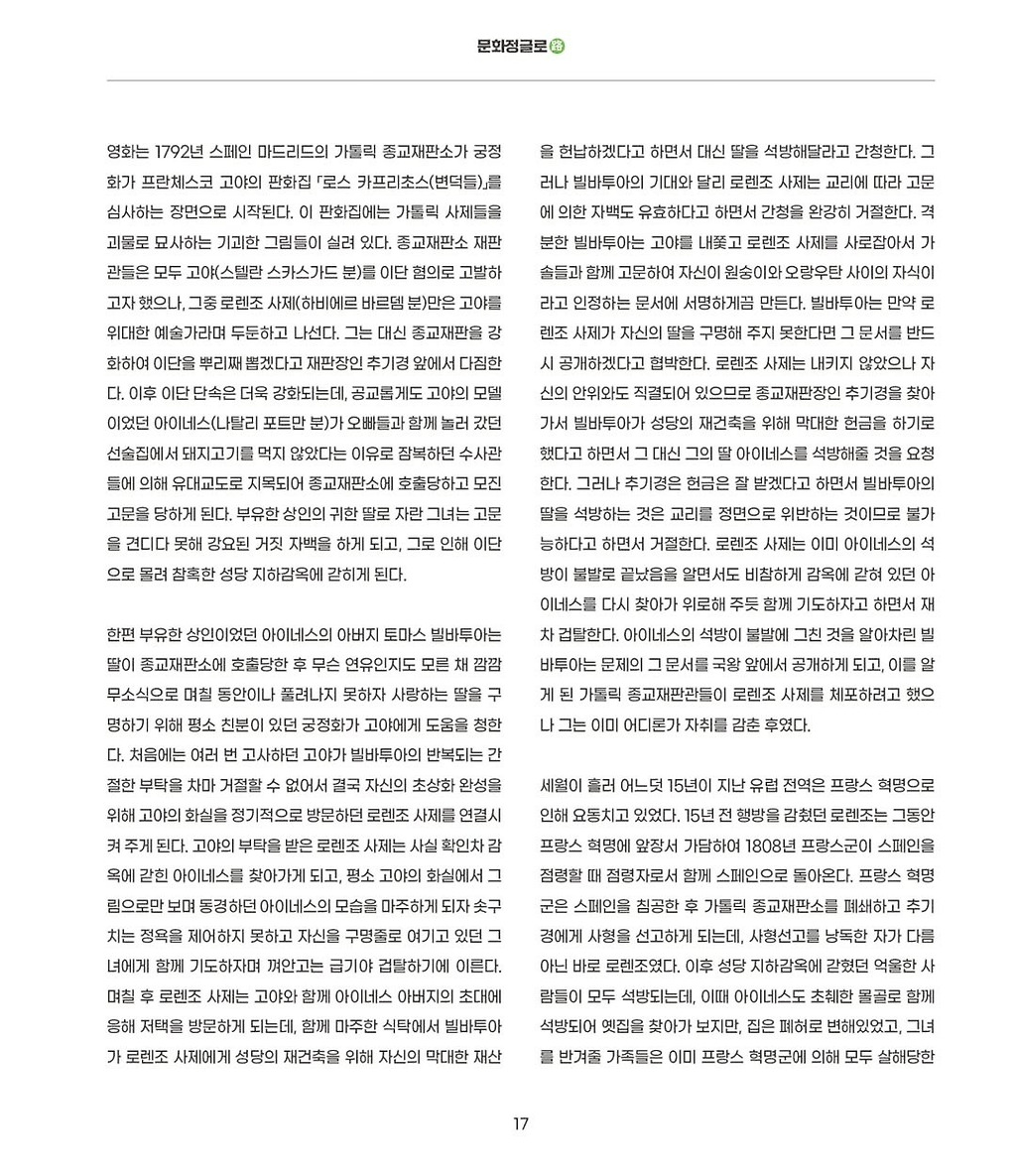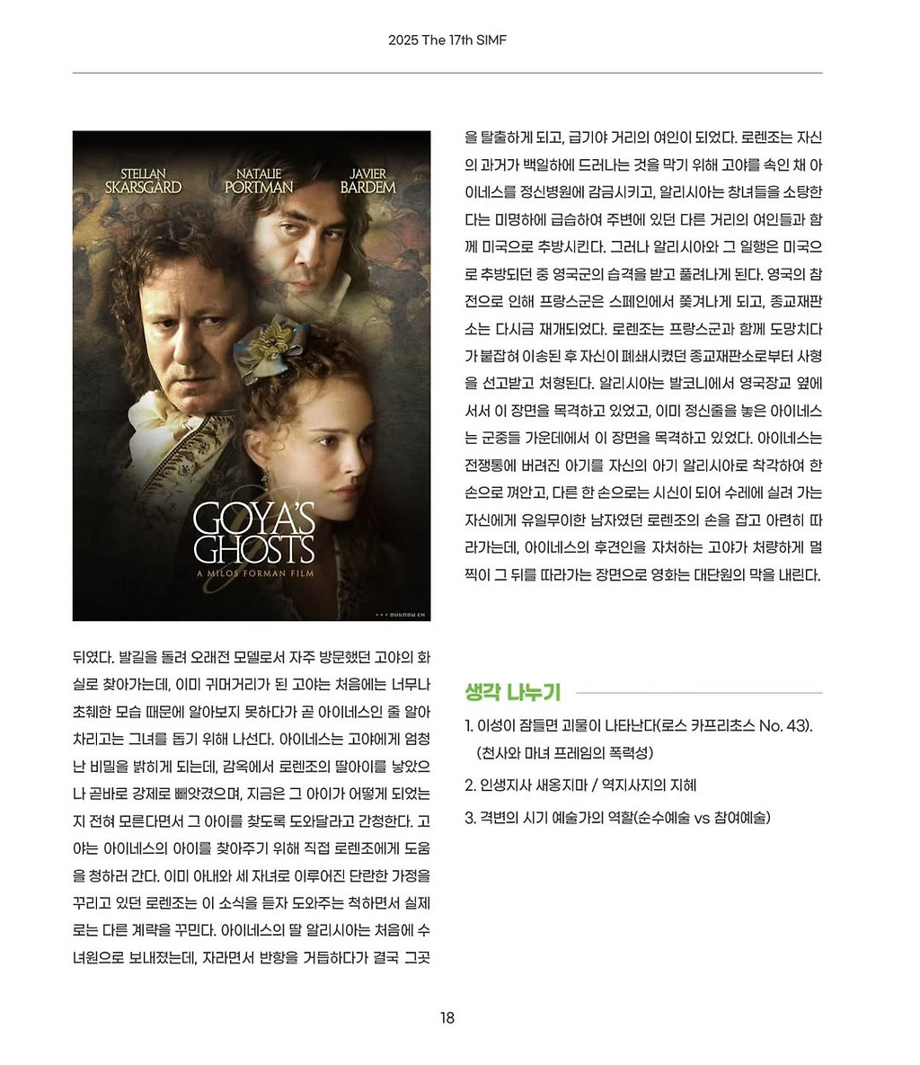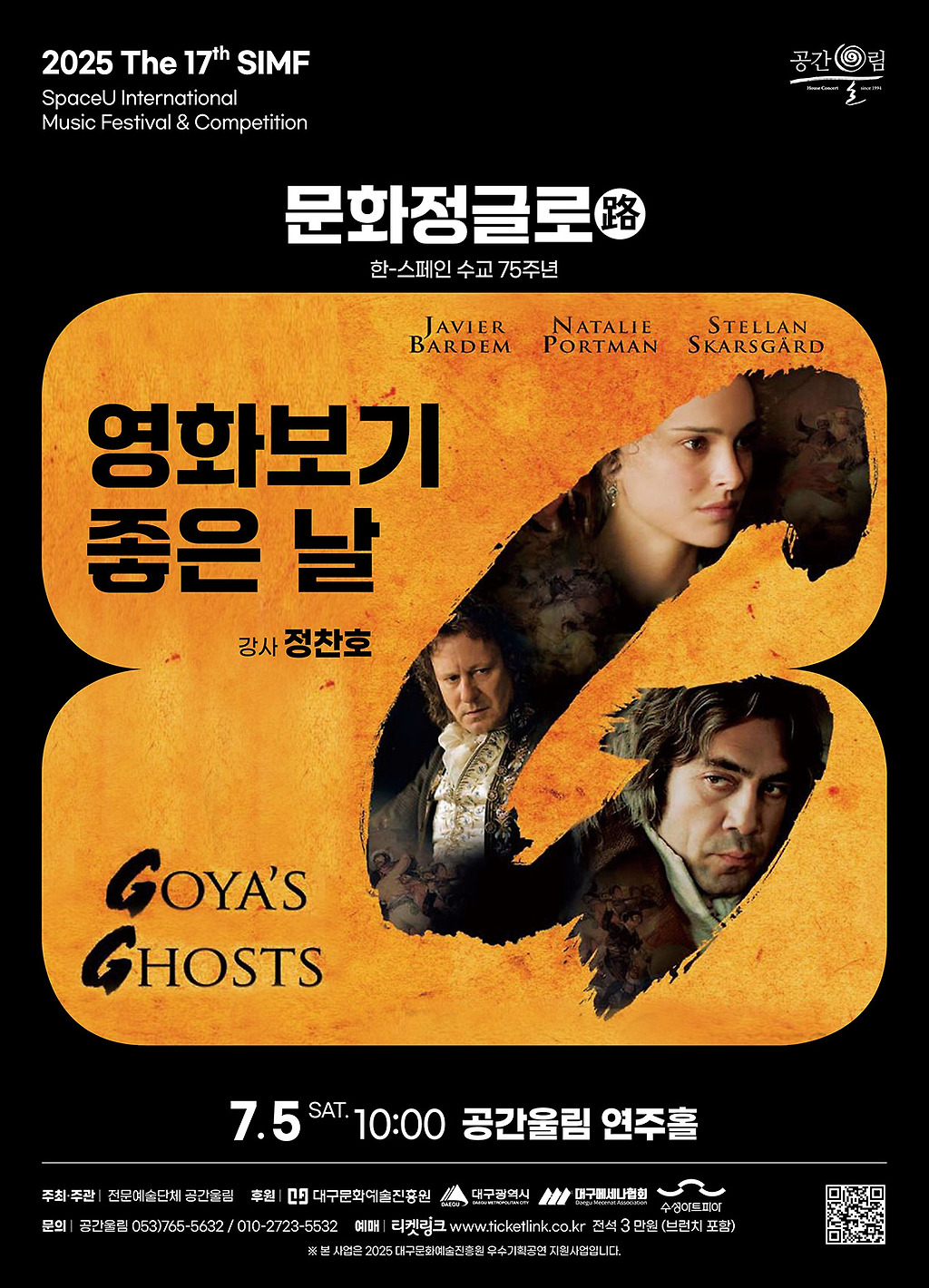 공간울림의 인문학 놀이터이다. 축제 성격에 따라 올해는 2006년 개봉된 스페인영화 ” 고야의 유령“ 을 함께 감상한다. 문학박사 정찬호교수의 진행으로 프란시스코 고야의 예술을 들여다 보고, 그 시대의 사회와 정치. 도덕적 상황과 그에 얽힌 한 여성의 삶을 한편의 영화를 통해 나누어 보는 시간