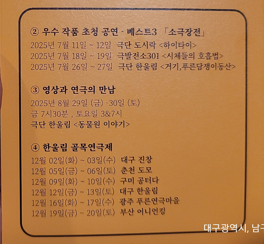 #대구연극 #대구뮤지컬 #대구공연 #대구문화 #대구공연정보 #대구공연후기 #대명공연거리 #한울림소극장 #극단_도시락 #베스트3소극장전 #연극_하이타이 #대구일반인극단 #대구일반인연극 #해아람 #포시즌스카이