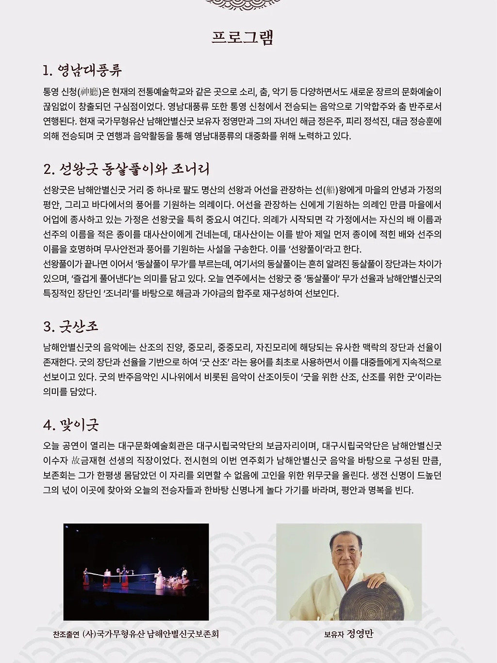 국가무형유산 남해안별신굿 음악들을 풀어내는 무대를 준비하고 있습니다!