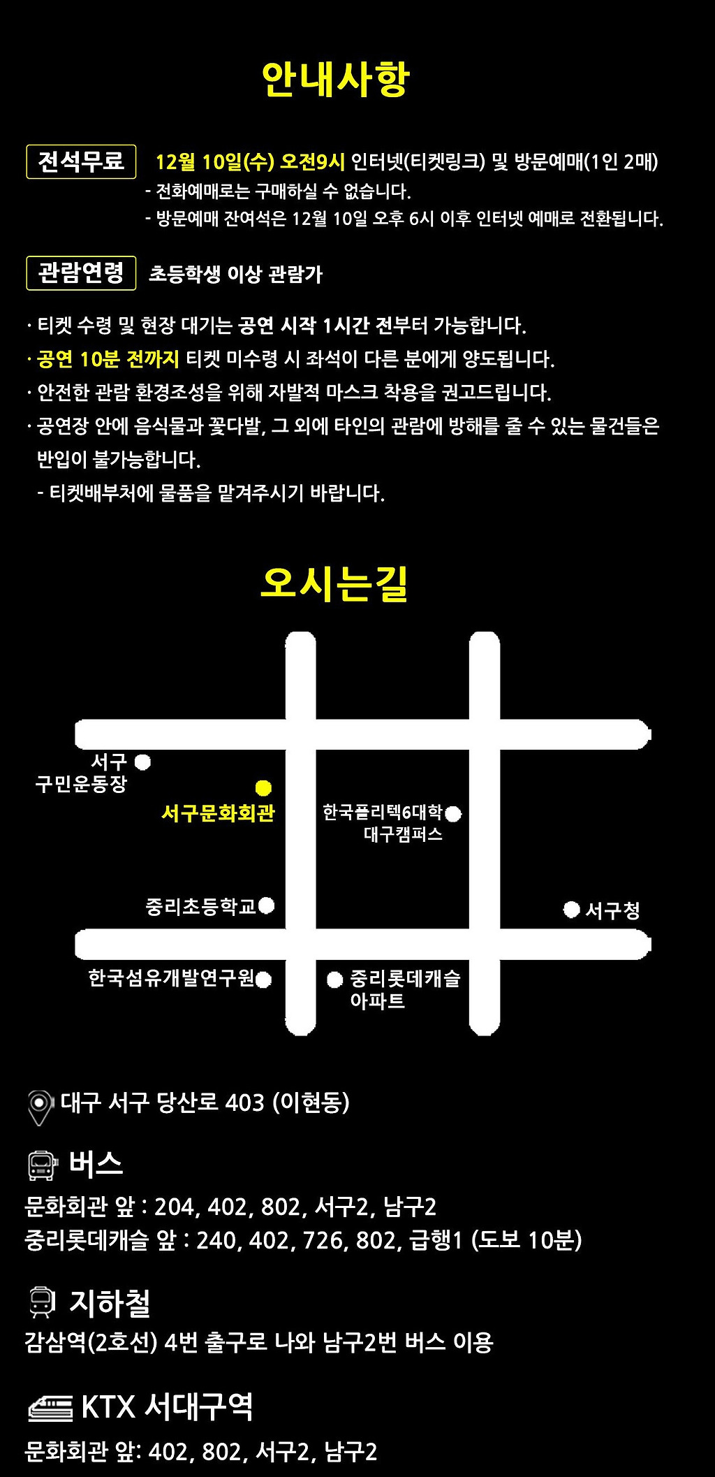문의 : 053) 663-3081 (대구광역시 서구문화회관)