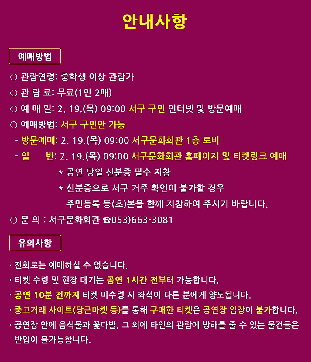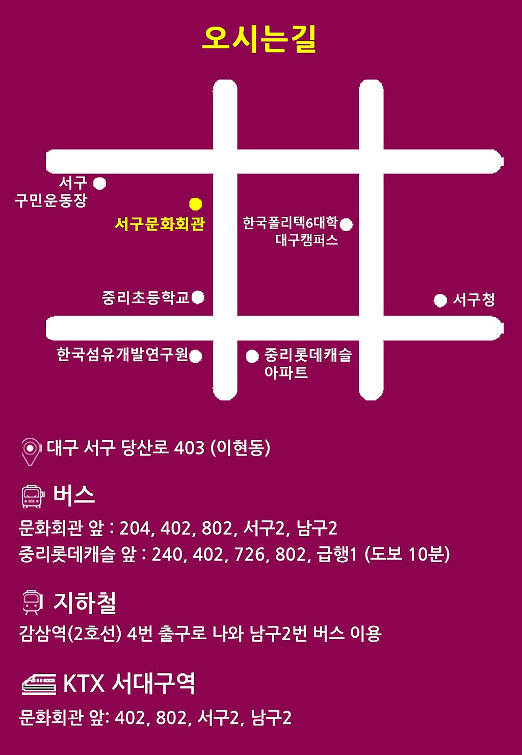 문의 : 053) 663-3081 (대구광역시 서구문화회관)