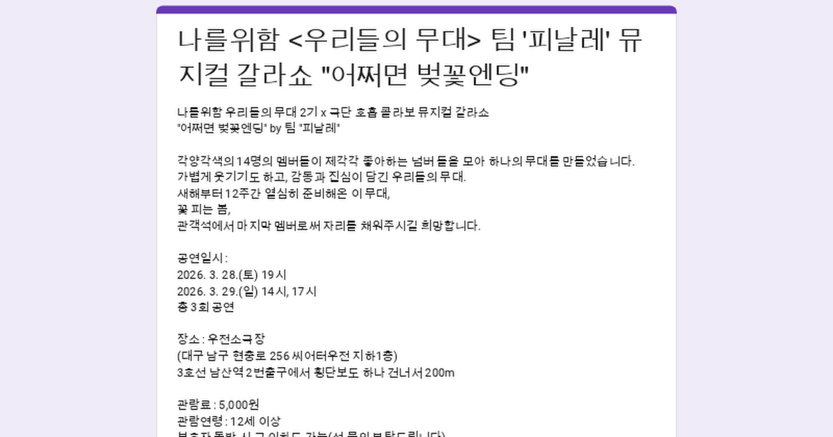 해아람 연극 아름다운 사인에 함께할 가족을 모집 https://naver.me/5UV712Vr (~26.4.01일까지 모집)