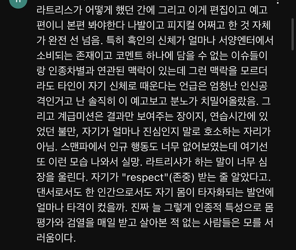 그러나 어찌됐건 타인종 댄서에게 노력하지 않고 피지컬로 승부보려 하는 거 같다는 발언을 한 듯한 장면이 예고를 타면서 엄청나게 반응이 안 좋은 상황