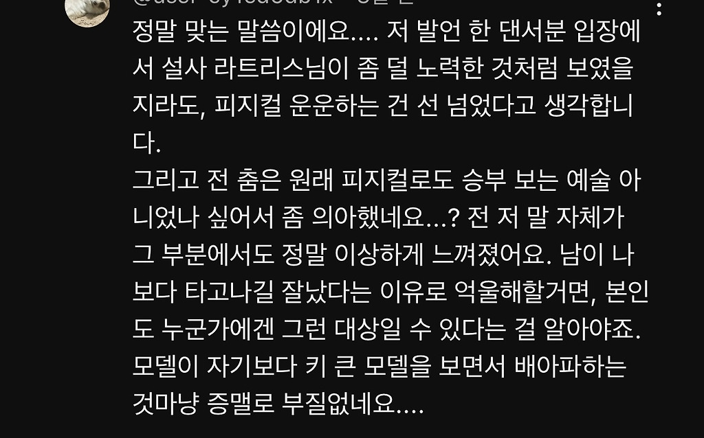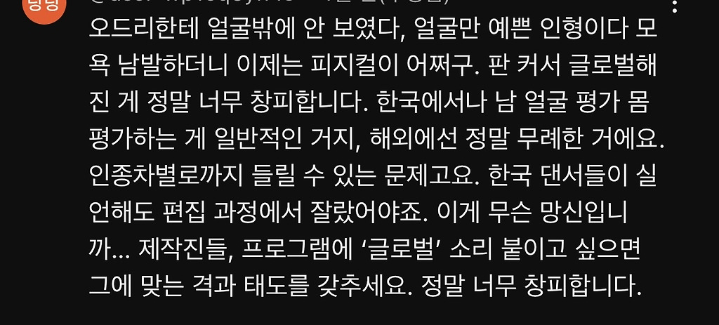 (1화에서 다른 댄서들에게도 계속 외모로 평가하듯 말한 것도 같이 지적받고 있음)