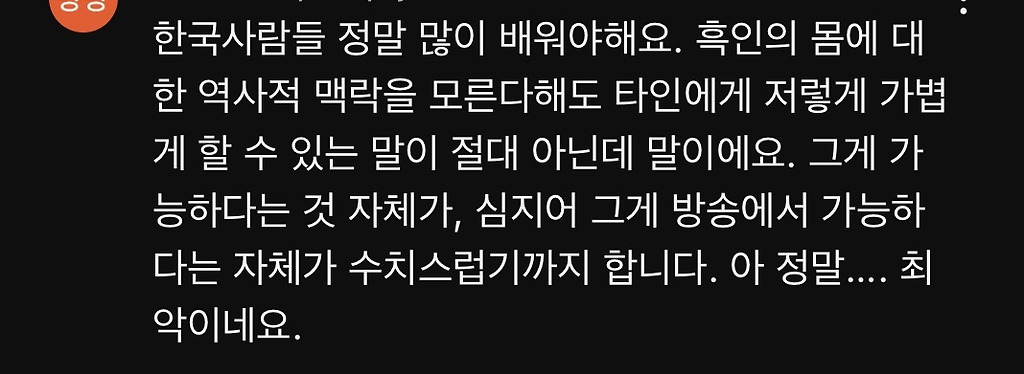 이게 악편이라면, 인종차별적으로 보이는 발언을 단순 개개인 감정싸움마냥 편집에 이용해 먹으려 한 방송사 측도 참 아쉬움