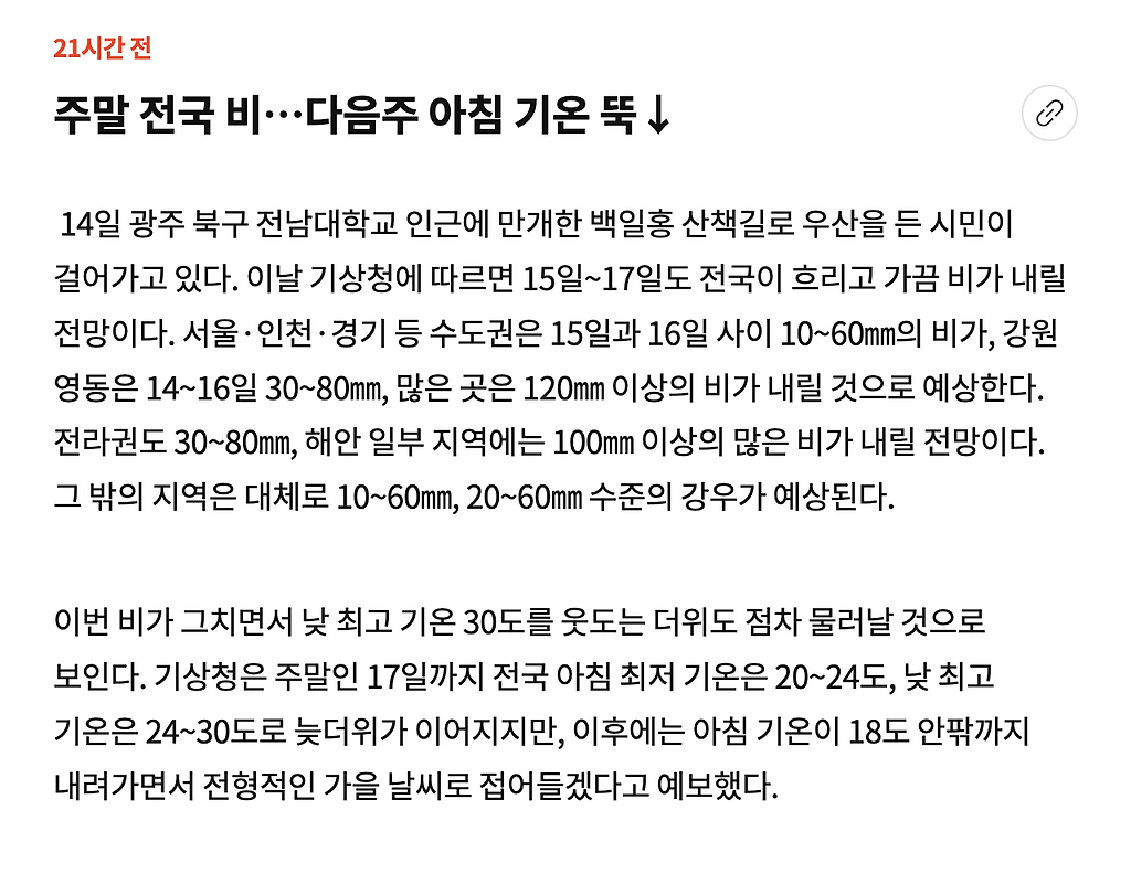 [포토타임]주말 전국 비…다음주 아침 기온 뚝↓ | 중앙일보