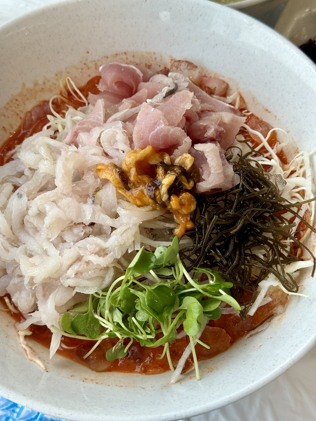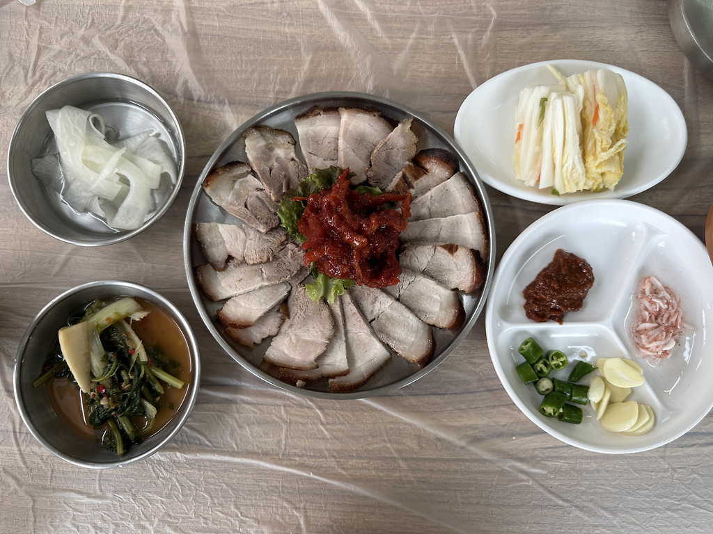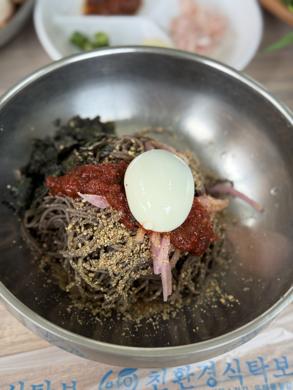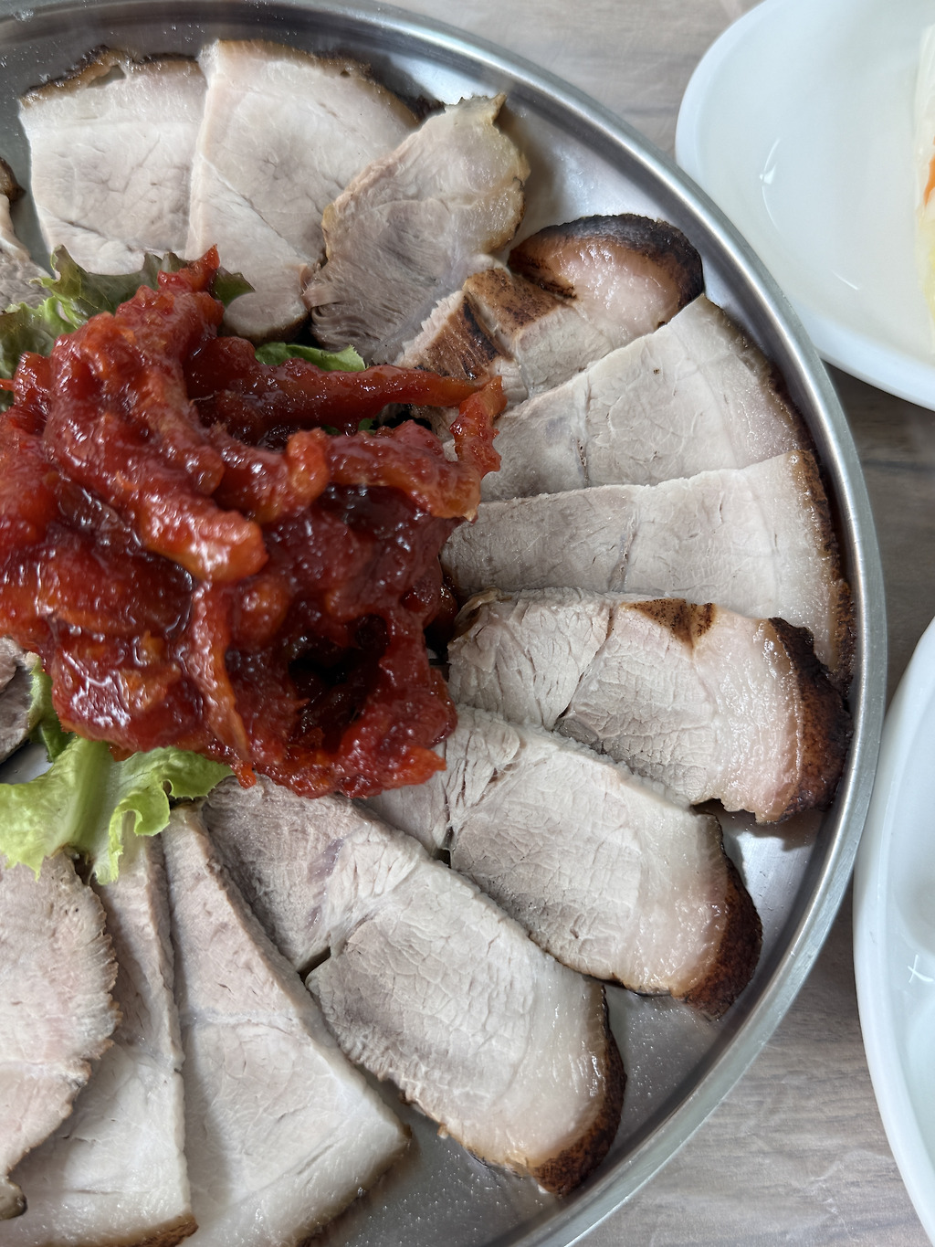 진짜 올해 먹은 음식 중 손에 꼽을 정도로 맛있었다. 특히 특히 저 수육 진짜 맛있다. 약간 족발스타일의 느낌인데 진짜 먹으면 입에서 살살 녹는다. 함께 나온 명태회와 쌈채소와 함께 먹으면 맛이 진짜 끝장난다. 순메밀막국수도 순메밀인데도 이질감 1도 없고, 같이 나온 동치미국물과 양념장이랑 들기름 식초 좀 더 기호에 따라 첨가해먹으면 진짜 두 그릇도 먹을 수 있을 거 같았다. 찐맛집 인정.