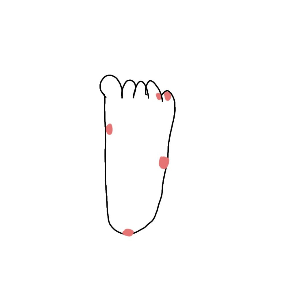 약지발가락과 발 양 옆 , 거의 없지만 간혹 신발때문에 발뒷꿈치에 종종 생기기도함.