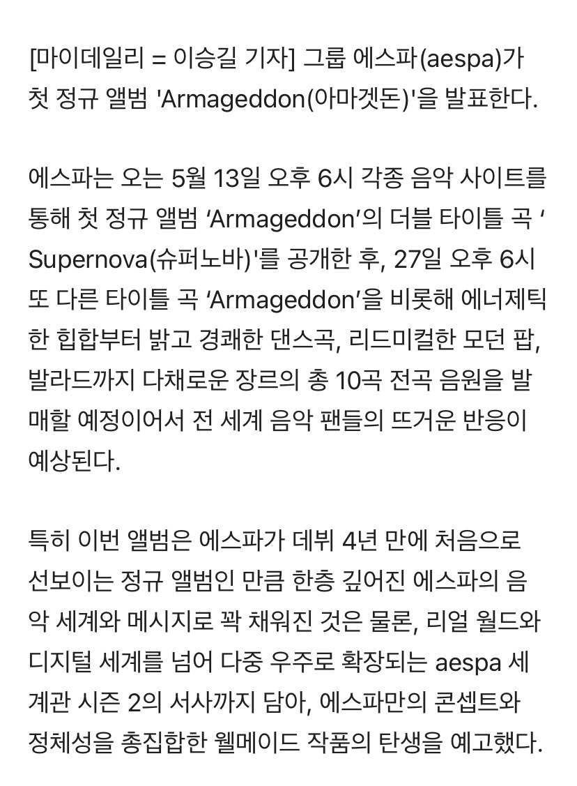 [마이데일리 = 이승길 기자] 그룹 에스파(aespa)가 첫 정규 앨범 'Armageddon(아마겟돈)'을 발표한다. 에스파는 오는 5월 13일 오후 6시 각종 음악 사이트를 통해 첫 정규 앨범 ‘Armageddon’의 더블 타이