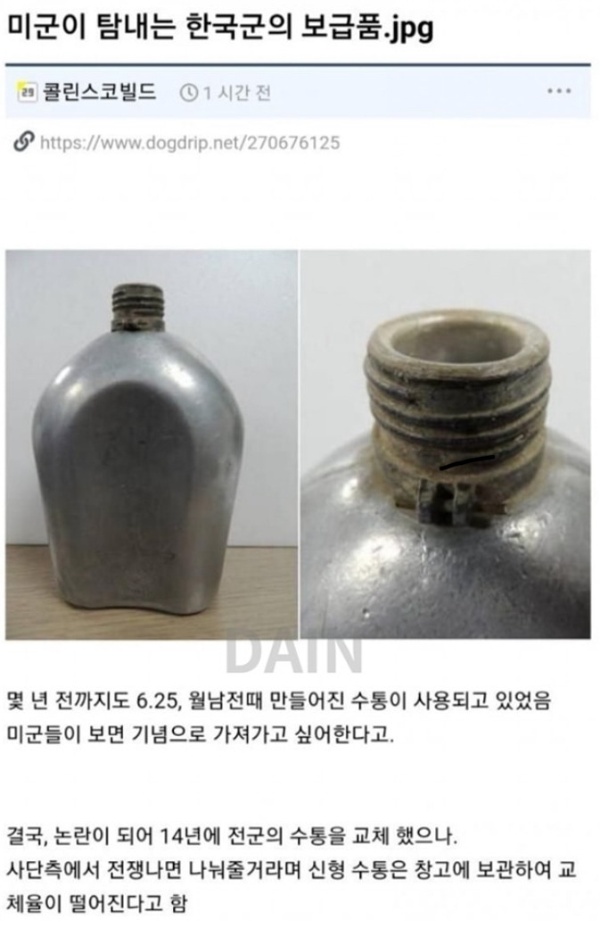 몇 년 전까지도 6.25, 월남전때 만들어진 수통이 사용되고 있었음 미군들이 보면 기념으로 가져가고 싶어한다고.결국, 논란이 되어 14년에 전군의 수통을 교체 했으나.사단측에서 전쟁나면 나눠줄거라며 신형 수통은 창고에 보관하여 교 체율이 떨어진다고 함출처 개드립