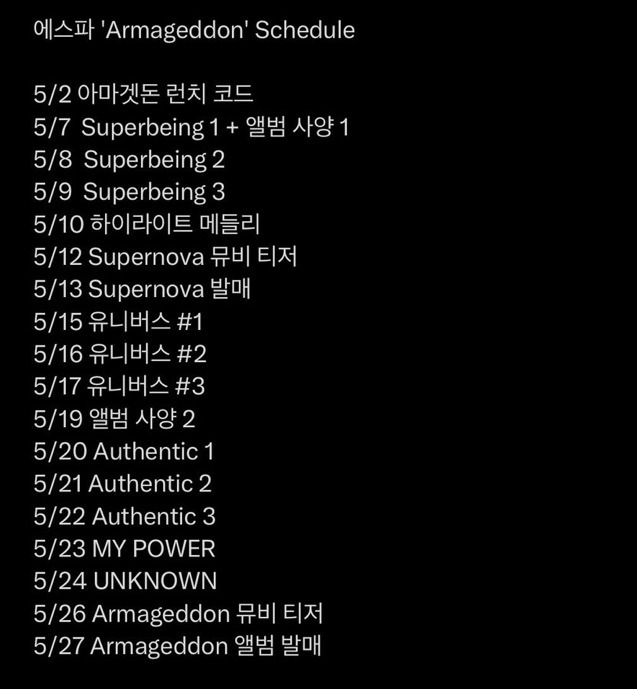 aespa's 1st Album "Armageddon" will be released on May 27th, 6PM (KST).