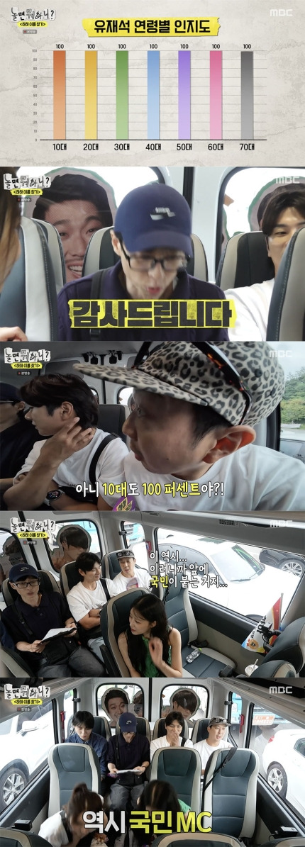 반면, 유재석은 전 세대에서 모두 100%의 인지도 수치를 달성했다. 놀라운 결과에 유재석은 카메라를 향해 "감사합니다"라고 인사했고, 하하는 "이러니까 '국민' 타이틀이 붙는 거지"라며 감탄했다.