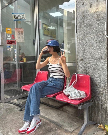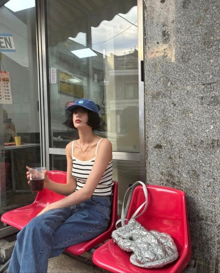 민소매 스프라이트 티셔츠와 청바지를 입고 청순한 매력을 뽐냈다. 맑은 피부와 날씬한 몸매가 눈길을 끌었다.