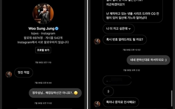 정우성 계정 운영자는 A씨에게 “멋진 직업”이라는 메시지를 처음 보냈고, A씨는 “정우성님, 해킹 당한 건 아니죠?”라며 놀라워했다.