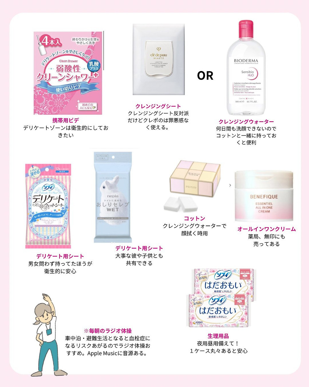 -화장솜 : 물을 못 쓸 때 클렌징워터로 얼굴을 닦을수있음