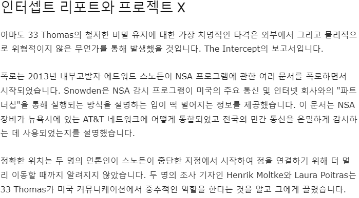 현재 NSA 와 AT&T 는 이 베일에 쌓인 건물과 감청본부의 정체가 언론에 나간 뒤 입장 표명을 전혀 하지 않고 있어.