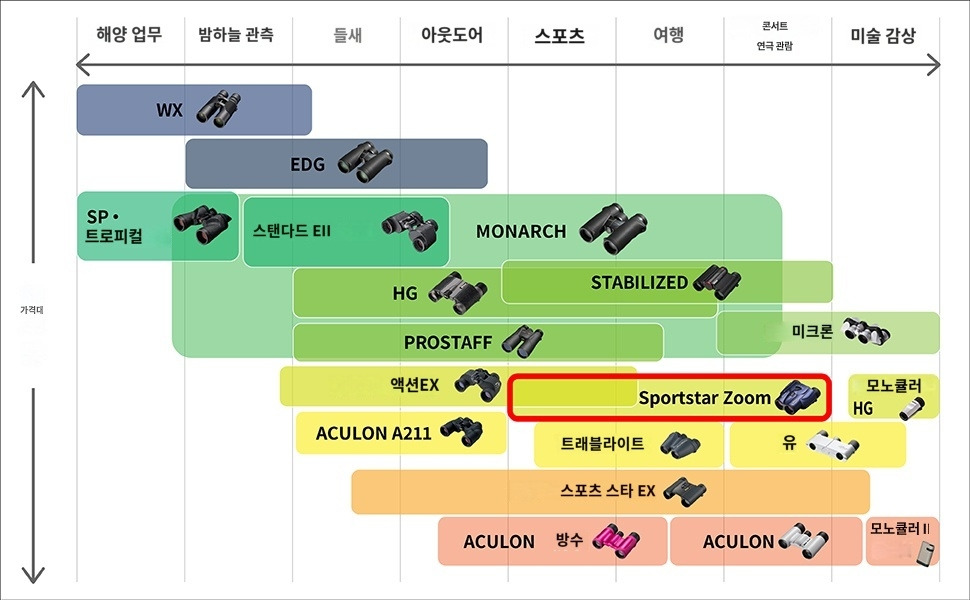 같은 배율과 렌즈 사이즈라면 브랜드 기술력이 이 분야를 결정함. 렌즈 가공부터 코팅, 흐려짐 방지 등등...