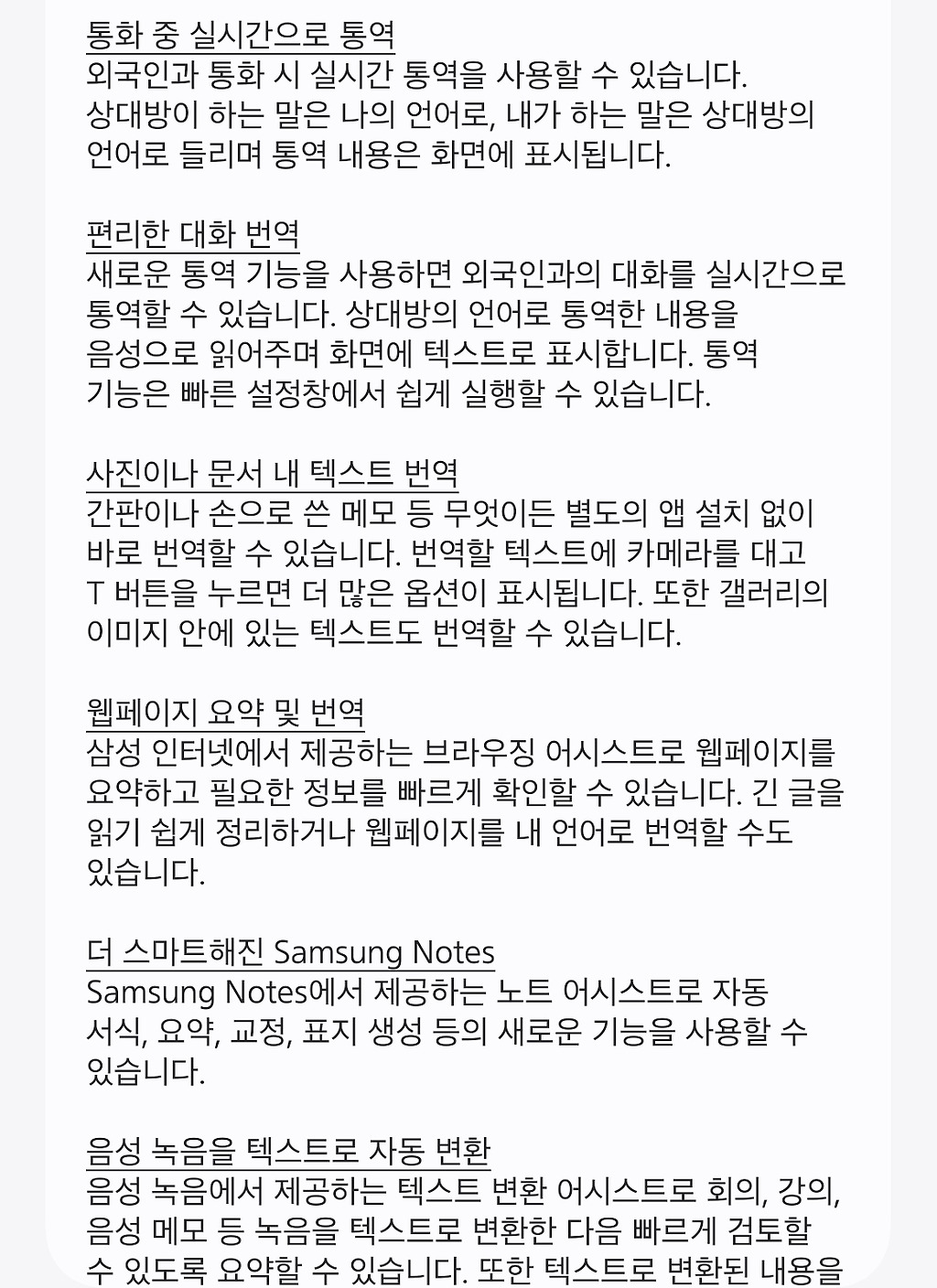 그외에도 기능 몇십가지 더 생김 (번역 맞춤법 통역 원하는 이미지 검색 이런 부분에서 많이 추가된듯 갤러리나 동영상 편집 더 좋아지고)