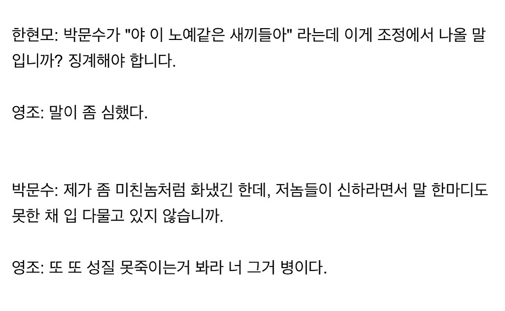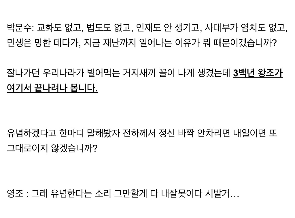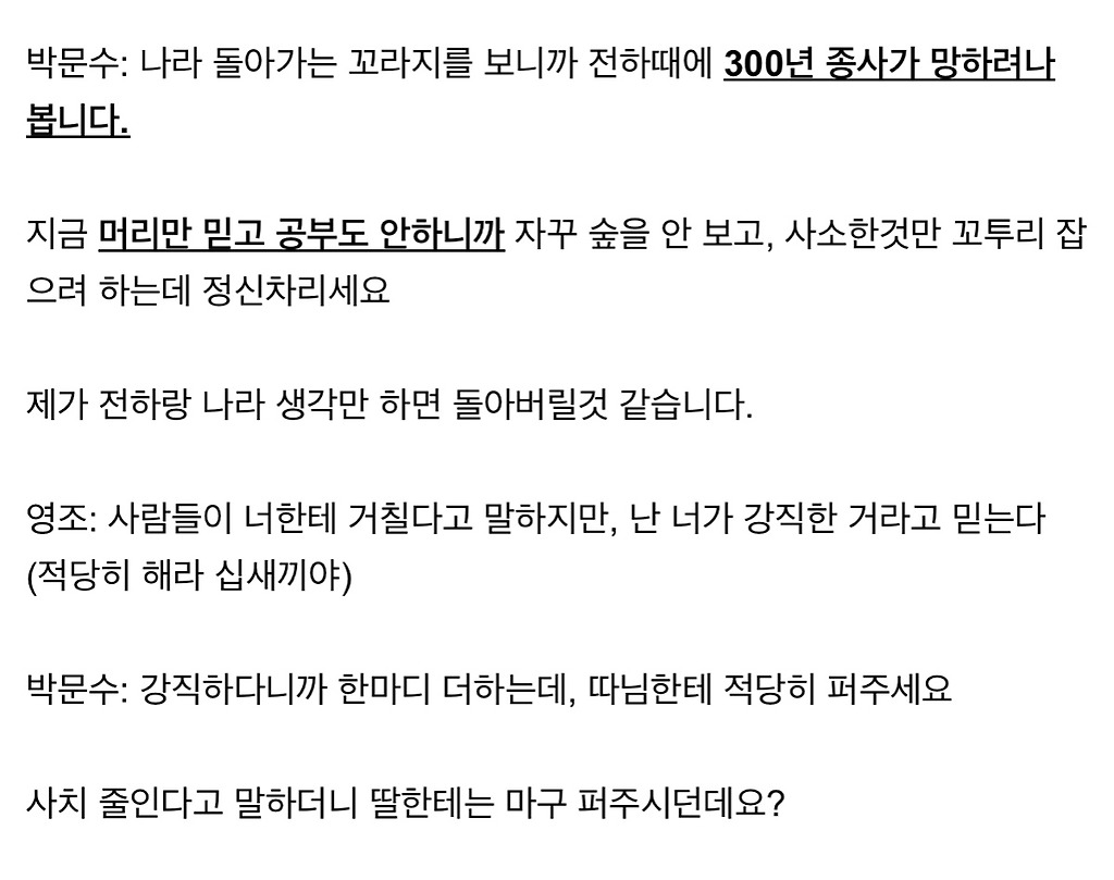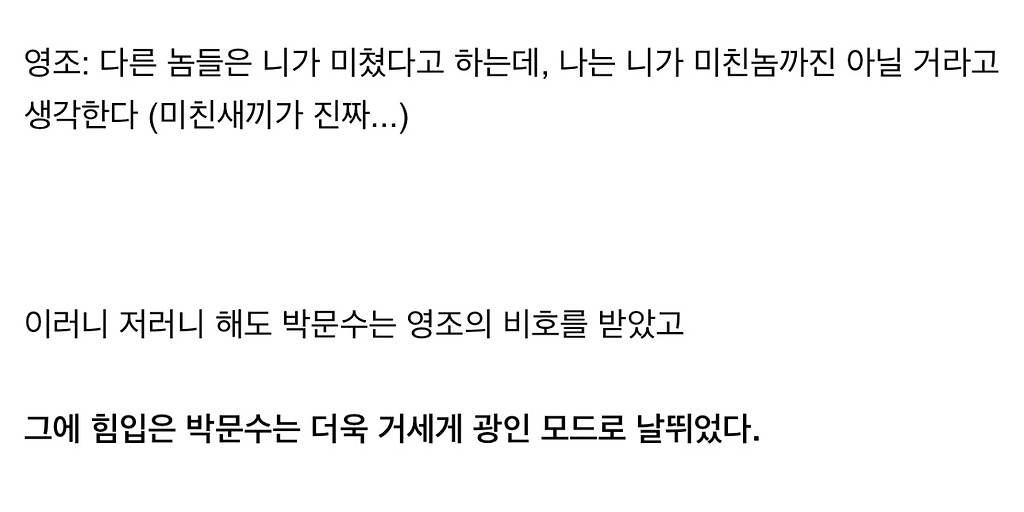 왕이 미친놈인 시대에 다 망한 소론 대표로 있으려면 저 정도 광기는 있어야했다는게 정설 (feat.탕평책)다른 애들 전하 죽여 주시옵소서할때 혼자 전하~ 죽여~보시옵소서~함