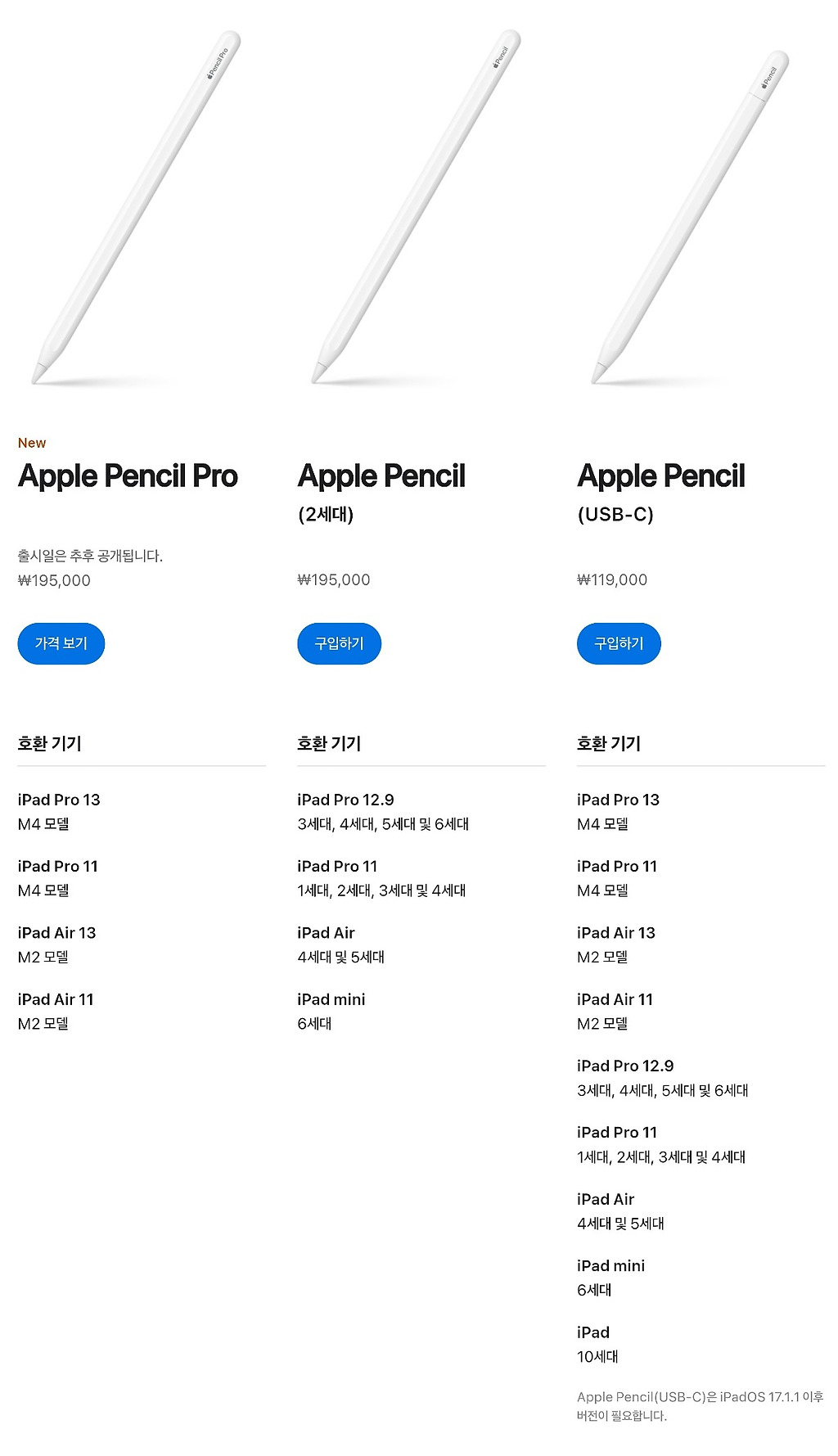 오른쪽 USB-C는 필압 같은거 안되는 아예 저가형 모델이고 중간에 2세대가 기존 애플펜슬인데 새로나온 아이패드 지원 안함...