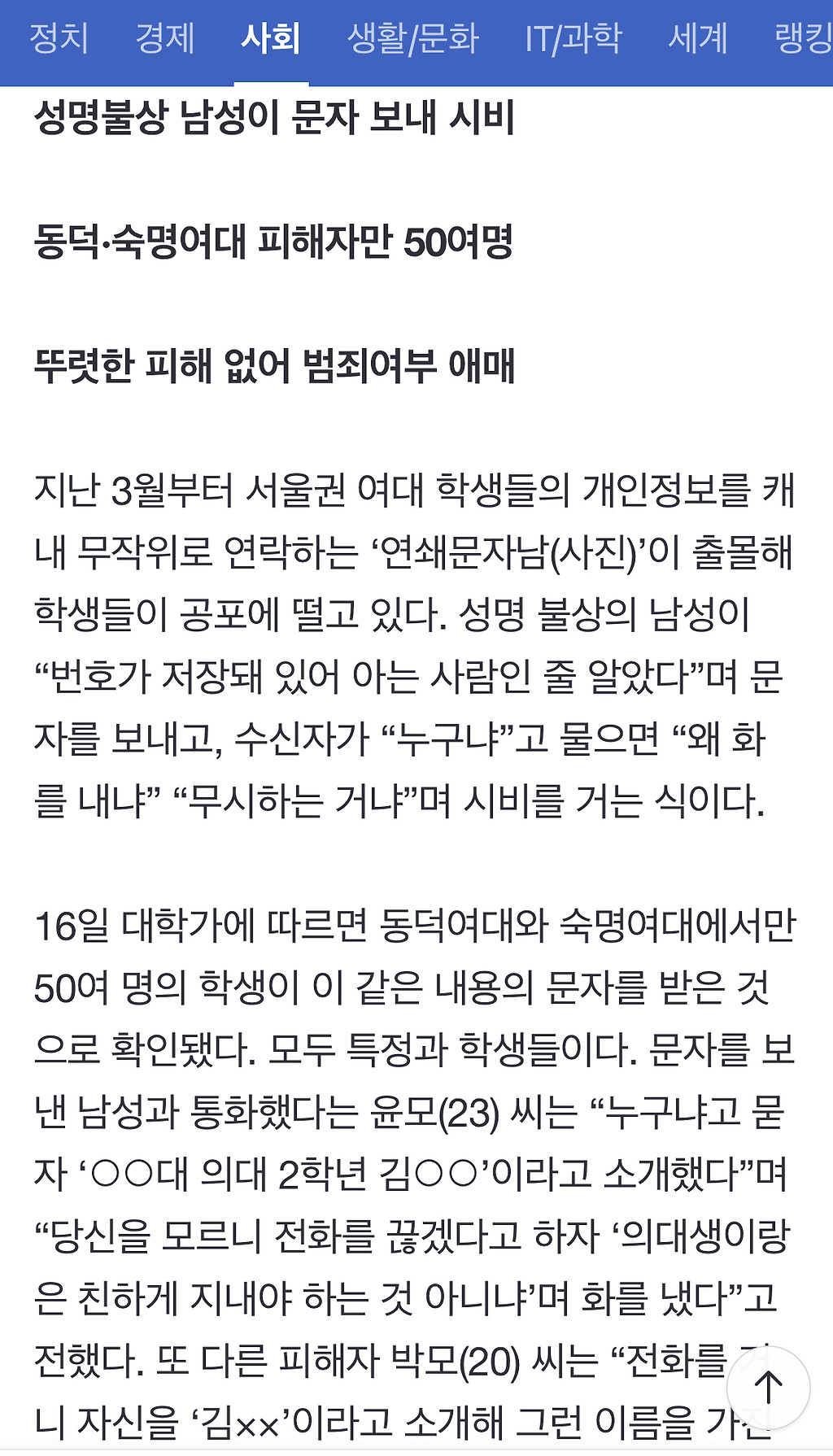 성명불상 남성이 문자 보내 시비 동덕·숙명여대 피해자만 50여명 뚜렷한 피해 없어 범죄여부 애매 지난 3월부터 서울권 여대 학생들의 개인정보를 캐내 무작위로 연락하는 ‘연쇄문자남(사진)