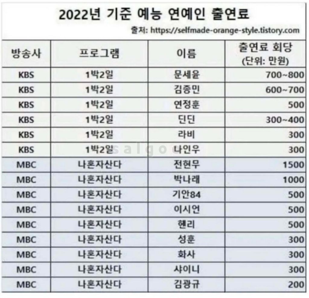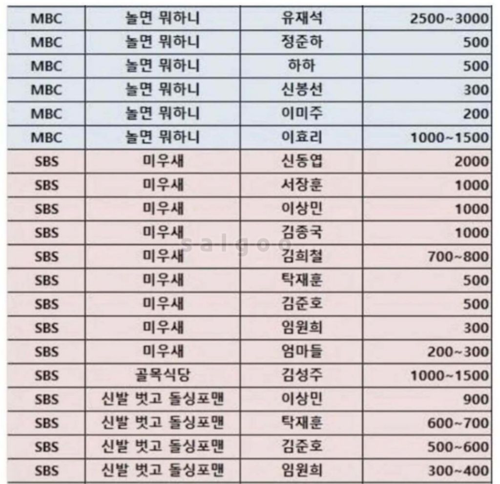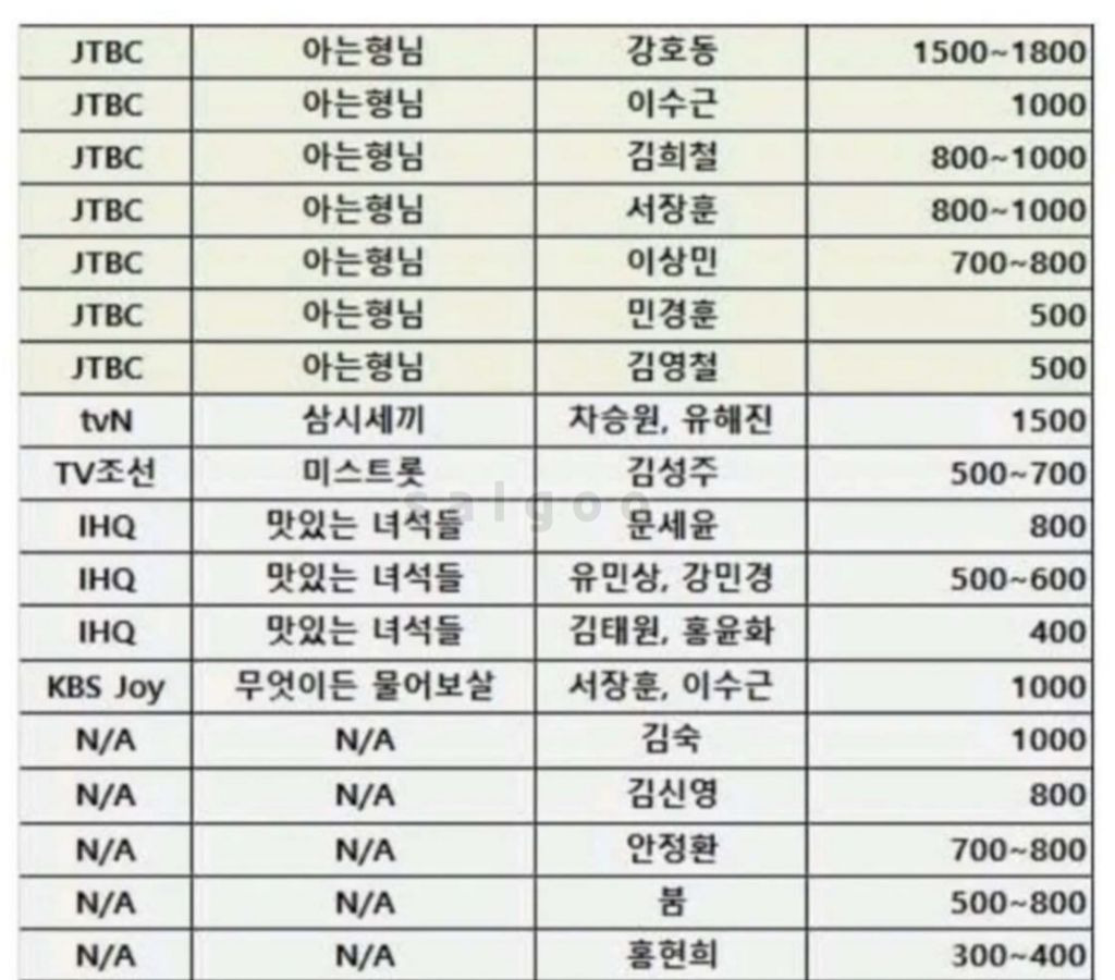 2년전 연예인들의 출연 단가표jpg