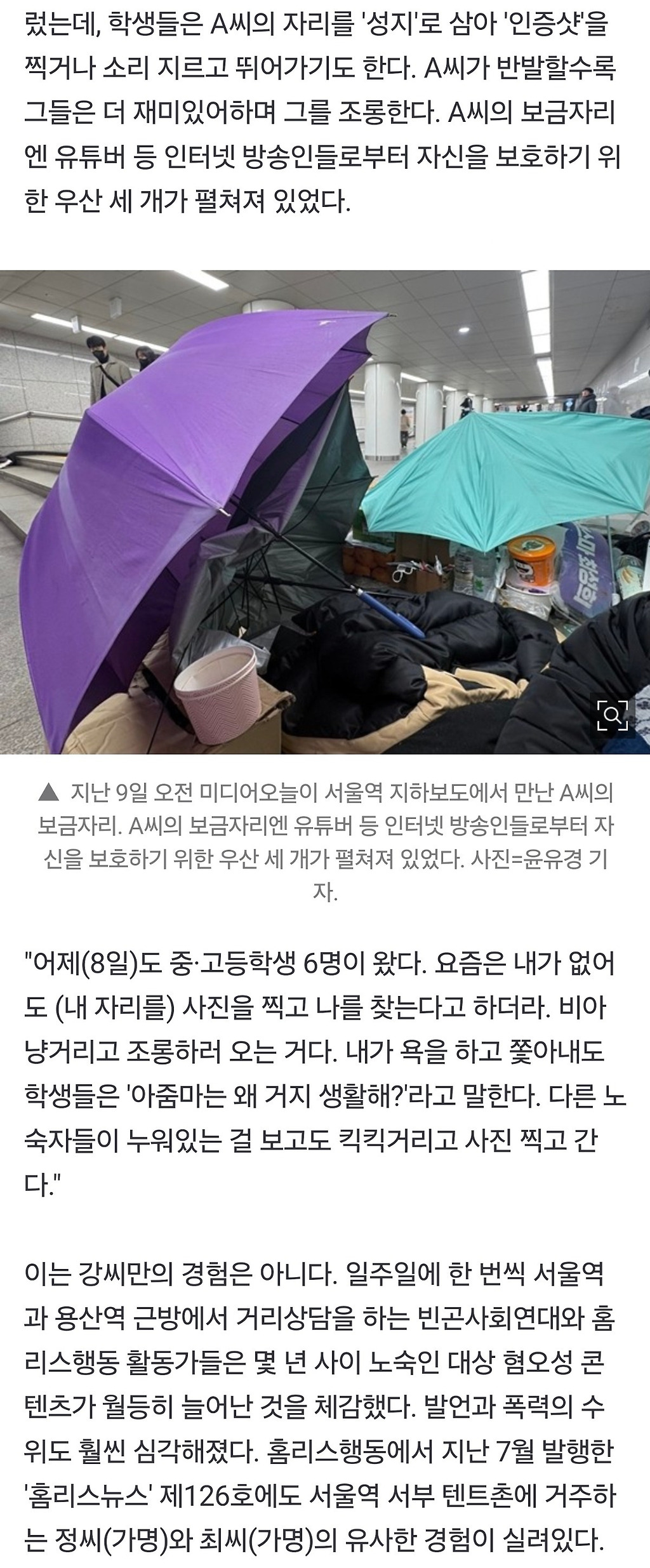 "내 박스를 뺏고 도망가서 쫓아가니 (유튜버들이) 영상으로 찍었다. 거지 분장을 하고 와서는 '우리도 거지에요'라고 하거나, 이불을 훔쳐가놓고 '내 이불 왜 훔쳐갔냐'며 쇼를 하기도 한다. 모자