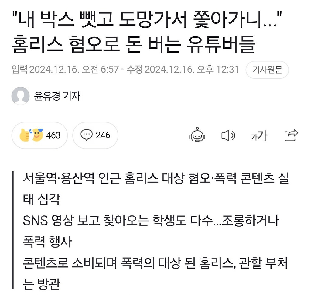 "내 박스 뺏고 도망가서 쫓아가니..." 홈리스 혐오로 돈 버는 유튜버들