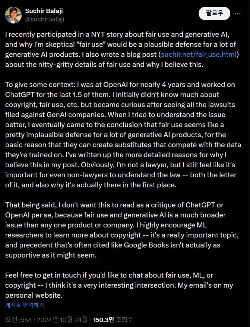 발라지는 지난 10월 뉴욕타임스와의 인터뷰에서 오픈AI의 저작권법 위반 행위에 대해 우려를 제기했던 인물이다. 당시 인터뷰에서 그는 "오픈AI는 챗GPT 개발 과정에서 저작권을 신경 쓰지 않고 인터넷에 유통되는 데이터를 자유롭게 사용했다"며 "이는 법을 위반하는 것이며 챗GPT와 같은 기술이 인터넷 세상을 해치고 있다"고 지적했다.