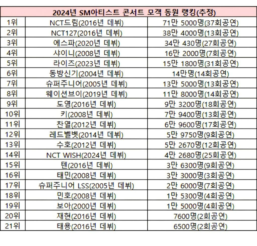 2024년 SM 아티스트 콘서트 관객 동원 순위