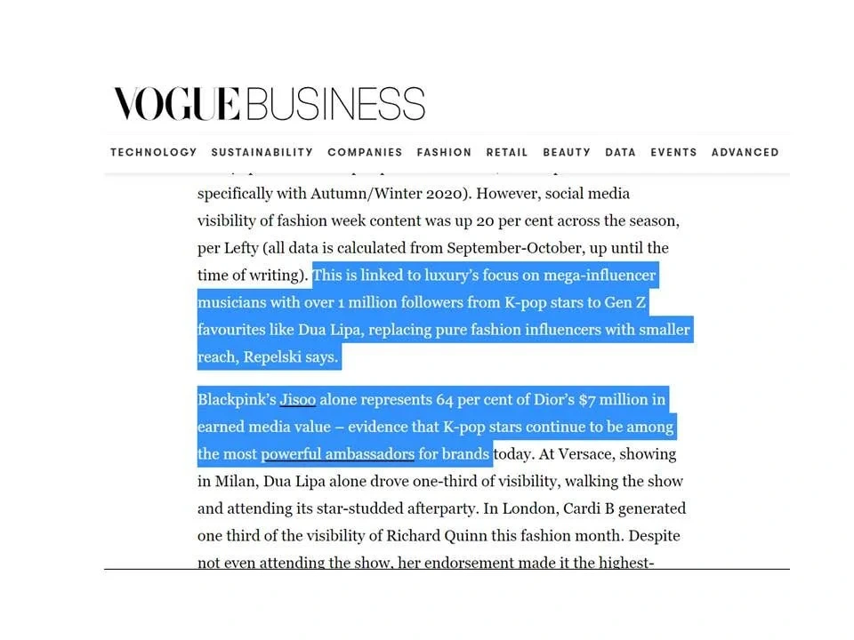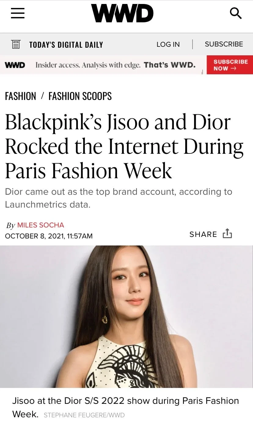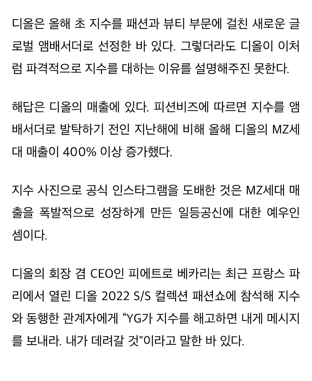 지수를 디올 글로벌 앰버서더로 영입하고 MZ세대 매출이 400% 증가했다는 기사가 냄