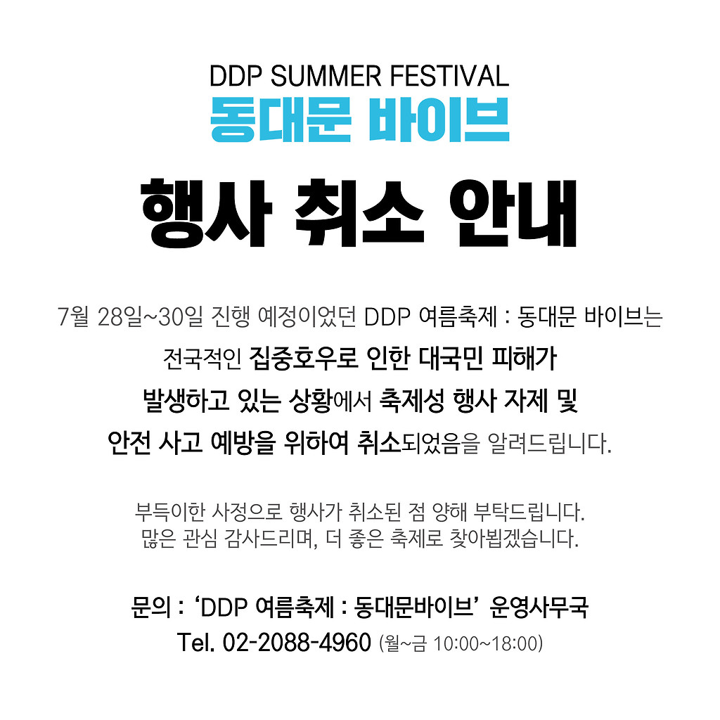 현재 전국적으로 호우가 계속되고 있고, 상당한 인명피해와 재산상 손실이 이어짐에 따라 DDP(동대문디자인플라자)에서 개최 예정이었던 'DDP 여름축제 : 동대문 바이브' 행사를 부득이하게 취소하게 되었으니 양해 부탁드립니다.