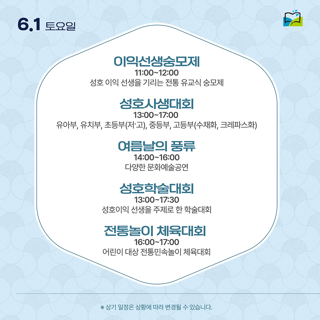 ○ 주요내용 : 이익선생 숭모제, 성호사생대회 및 다양한 전통문화 체험행사 등
