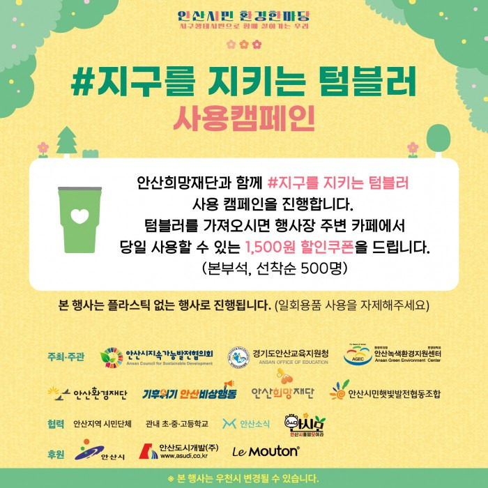 최근 이상기후로 환경의 중요성이 대두되고 있는 지금! 안산도 ‘환경의 날’을 기념하여 환경의 중요성을 재확인하고 환경보전 실천을 독려하고자 ‘안산시민환경한마당’을 개최합니다!