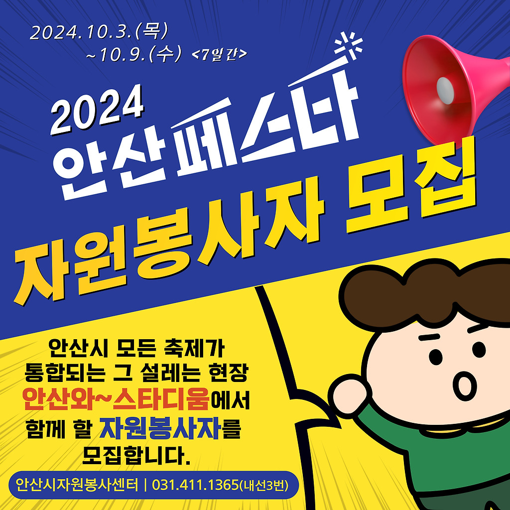 마지막으로 큰 행사라 자원봉사자도 모집하고 있답니다. 이 뜻깊은 자리에 함께하실 봉사자 여러분의 지원을 기다리며 이상 '안산페스타' 소개를 마칩니다.