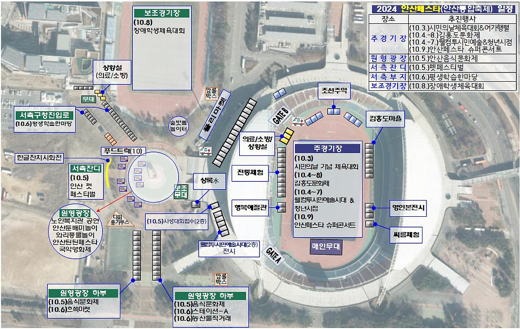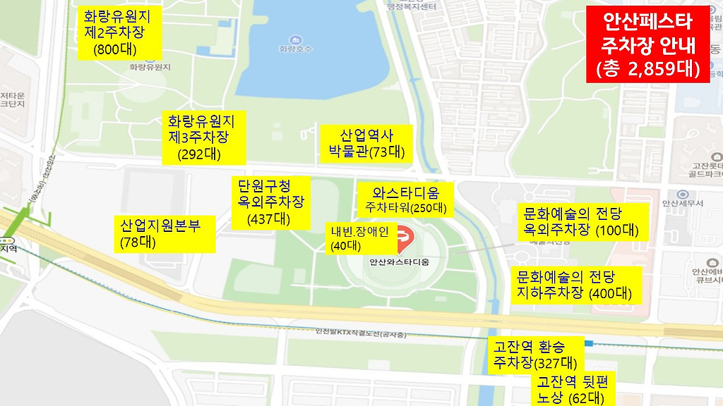 안산페스타 방문하시려는 분들께 자차는 절대 비추!! 행사당일 일대는 주차시설이 협소하고 혼잡하기 때문에 주로 대중교통을 이용해 주시길 추천합니다.(제발~) 만약 차량으로 방문을 해야 한다면 와스타디움 주차장이 아닌 외부 주차장을 이용해 주시기 바랍니다.