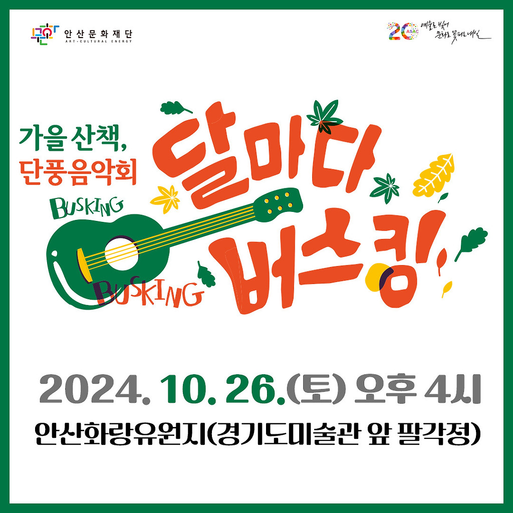 2024.10.26.(토) 안산화랑유원지(경기도미술관 앞 팔각정)에서 16시부터 18시까지 진행하고 청악, 풍물마당 터주, 감성밴드 파인트리, 이윤선이 출연하며 부대프로그램으로 아로마 감정오일, 퍼스널컬러 운영 등이 있습니다.