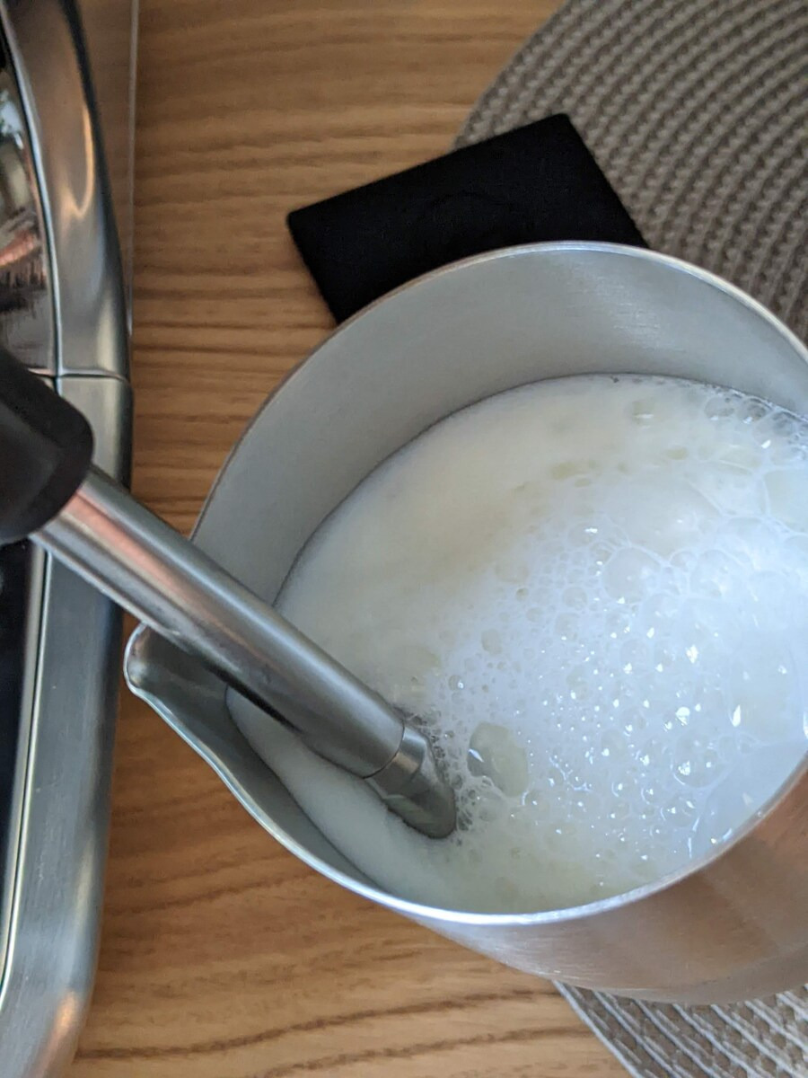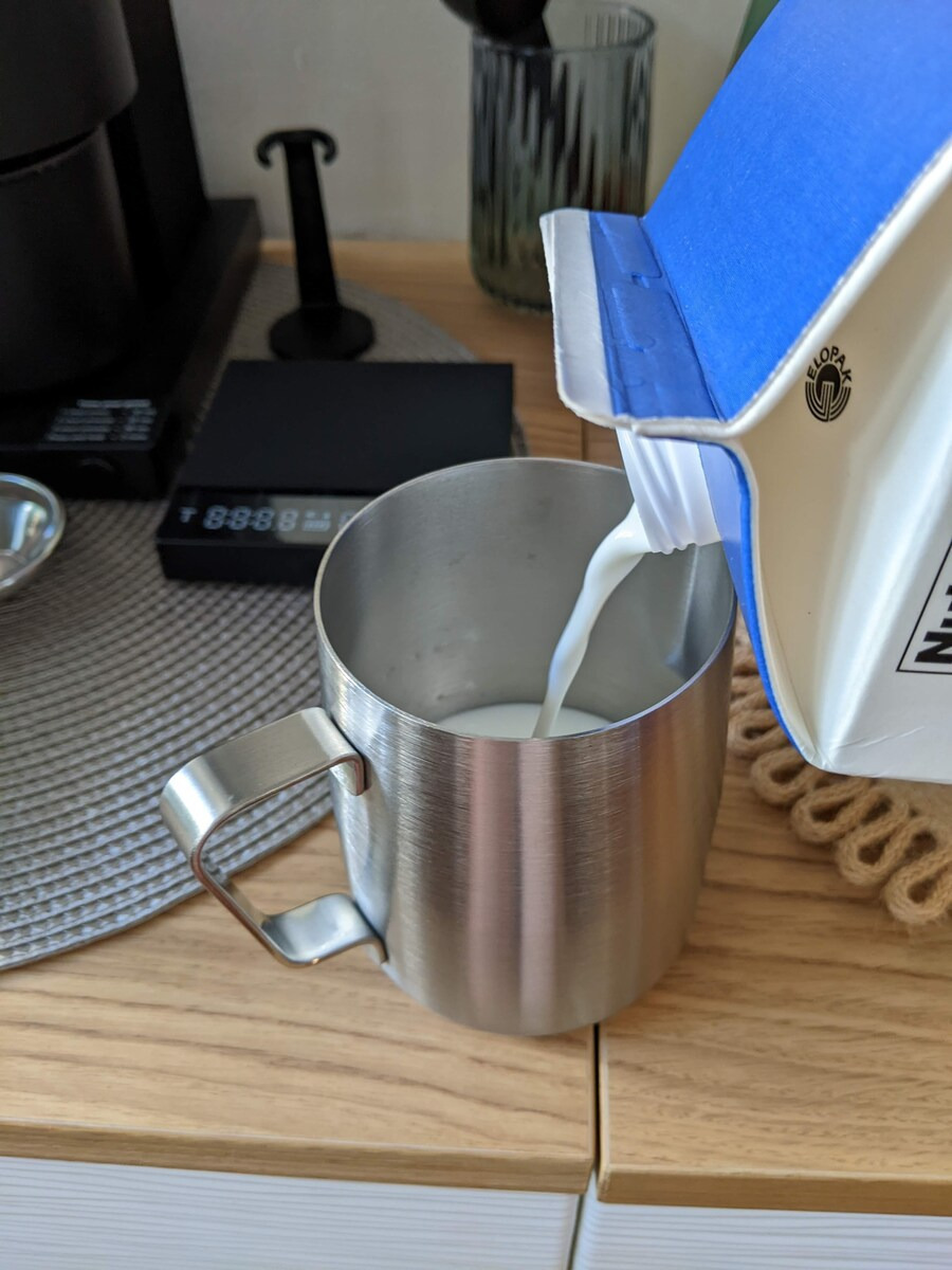피쳐가 손으로 대기 뜨겁고 우유에 실크 같은 찰랑임이 생기면 완료.