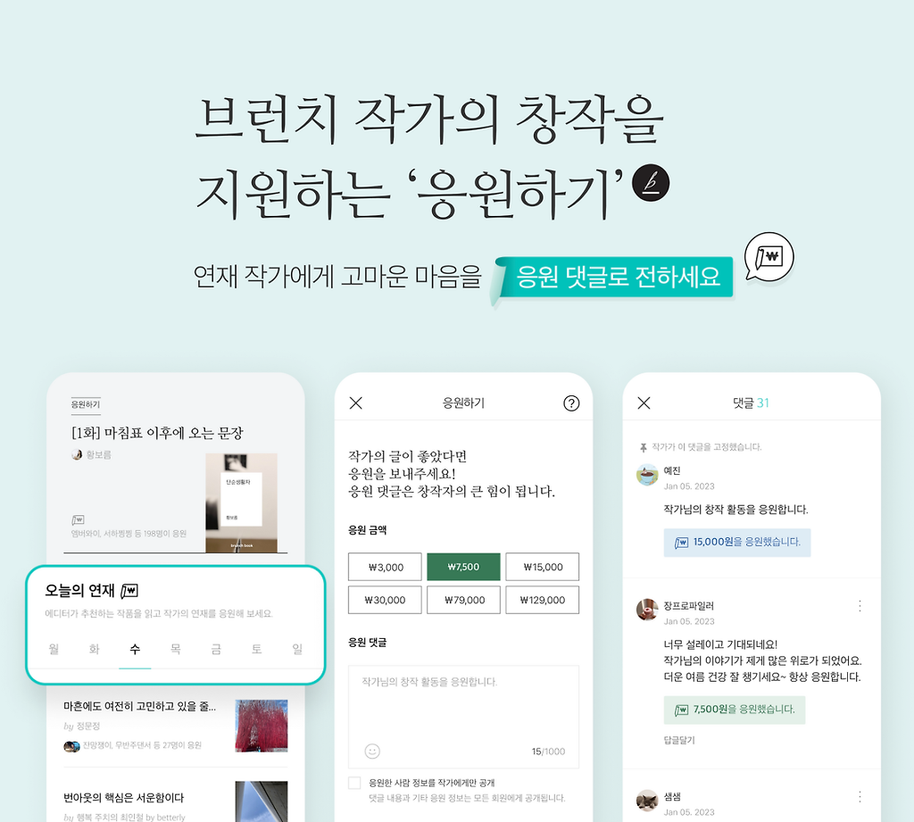 연재되는 글을 읽고 작가를 응원하고 싶으면 금액을 지정해서 댓글과 함께 전달할수 있네요~. 브런치에서 글을 쓰는 분들의 창작활동에 큰 도움이 될 것 같아요!