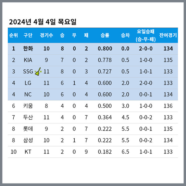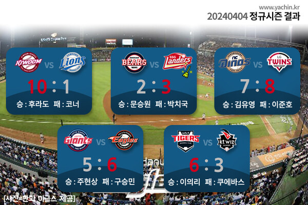[KBO] 프로야구 4월 4일 경기결과 및 순위