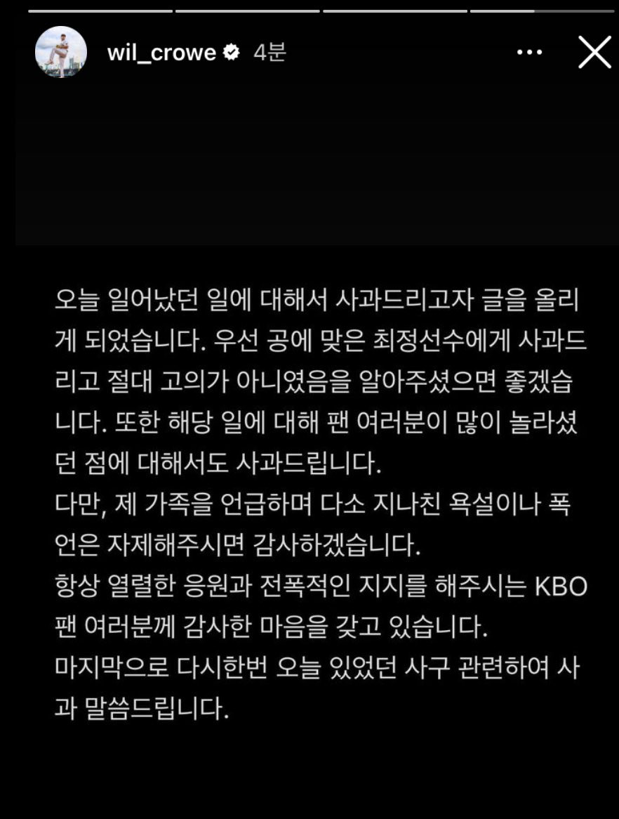 [KBO] 기아타이거즈 용병투수 크로우가 인스타 스토리에 올린 사과문